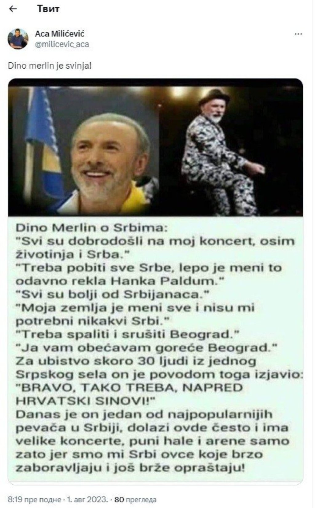 Zasto se vracati u proslost, sta ne trebamo svi iskupa naprijed ici. dino takve izjave nije pravio. sve je to stampa i novinari. Gledam video gdje pise – dino pjeva ratnim zlocincima a u pitanju potpuno normana publika, zene, djeca.. ne pravite propagandu iz nicega..ovaj ujetnik je jedan i jedini.. ne trazite uzbune tamo gje ih ne treba biti. Narode- dokle proslost. svi smo istu sudbinu imali.i nikom se nista dobro desilo nije..ne izbacute sad to poslije toliko godina na dinu merlina koji je vec nastupao u beogradu i koji nije zasluzio ovako nesto.
